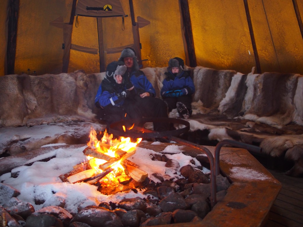 We started Day One learning some winter survival skills. Trekking into the forest listening to tales of our guide’s infamous hunting escapades, we were set the task of building a fire (while it snowed heavily) with only a flint and a hunting knife. Once roaring, we used our fire to brew a fine pot of pine-needle tea before journeying back to the toupee where we cooked/ate reindeer stew beside the fire.