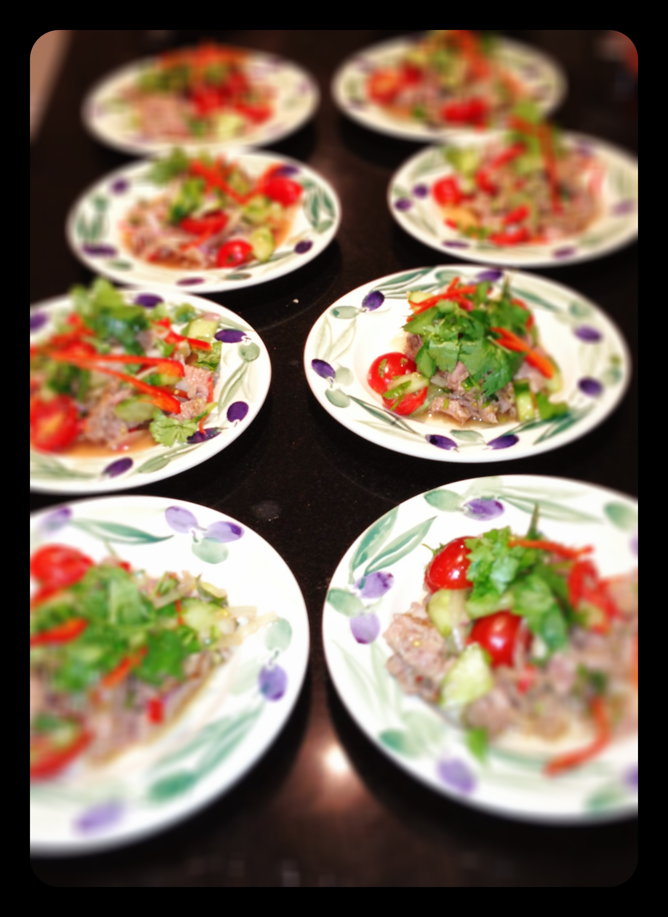 Brett brought our first course, Yum Nheurh, into the garden. A spicy salad of grilled beef with red chillies, cucumbers, onions, shallots and coriander with an outstanding dressing of Thai bird’s eye chillies, lime juice, palm sugar and garlic.