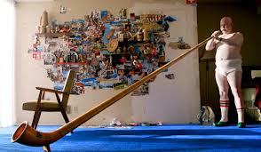 So, as I settled into my comfy seat at the Soho Screening Rooms, flashbacks of Matt Lucas’ pasty bulk were replicated on camera by the unnervingly simple and eccentric pants-only wearing, Switzerland-obsessed loner, Franklin Franklin. And as he blew on his beloved giant alpine horn, I soon realised that ‘Small Apartments’ as a whole is a simply a direct reflection of this unusual character.