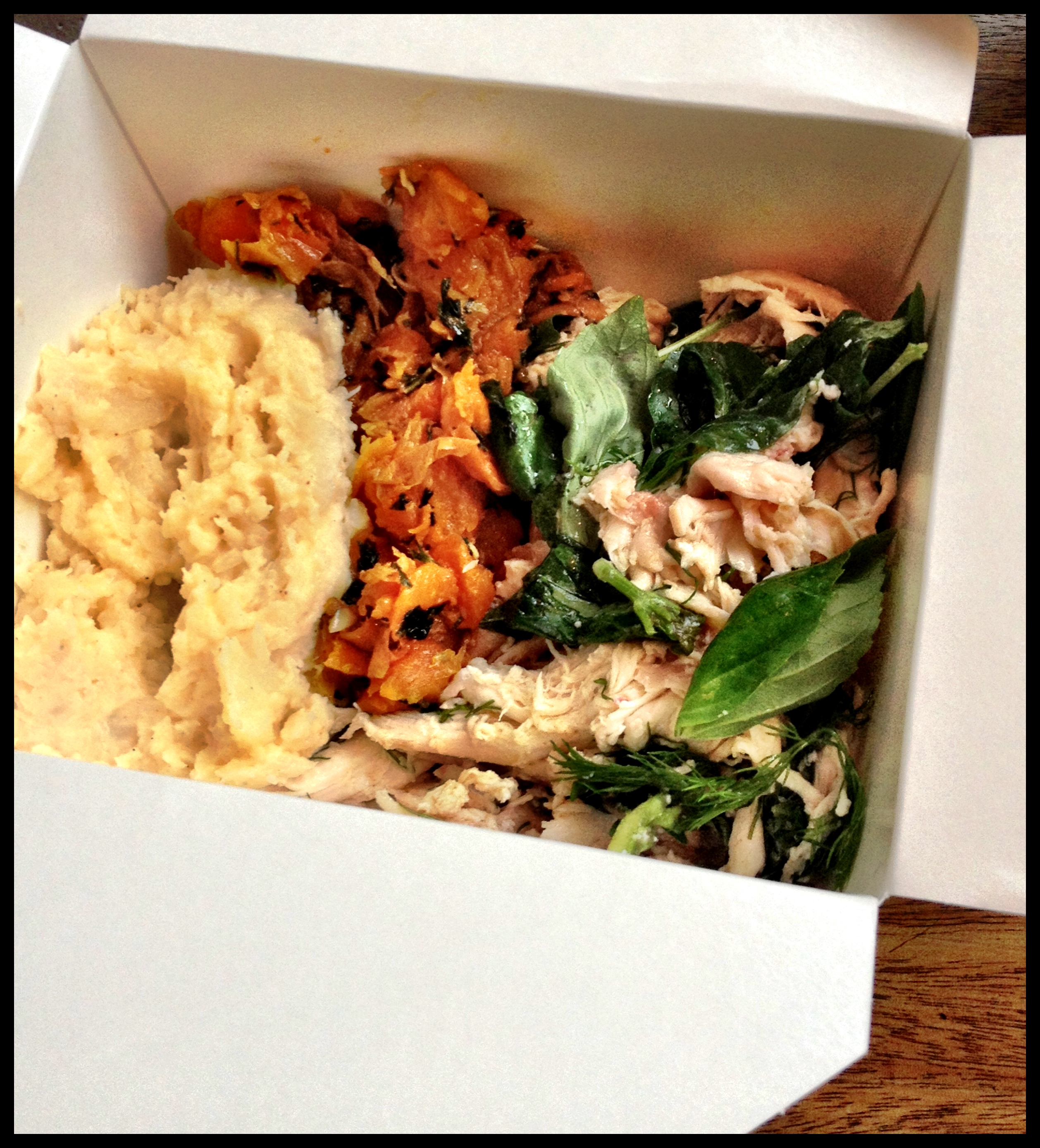 Her premises are clean, light, airy and attractive and the food is set out for you to choose from. The ribollita soup caught my eye (I love all those beans!) while the Smalls and their elders opted for the smoked chicken with parsley and watercress served with honeyed carrots and celeriac mash. The food is served in white boxes, which suits the majority of the lunchers as they are en route to home or office.